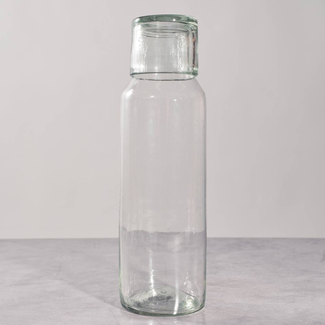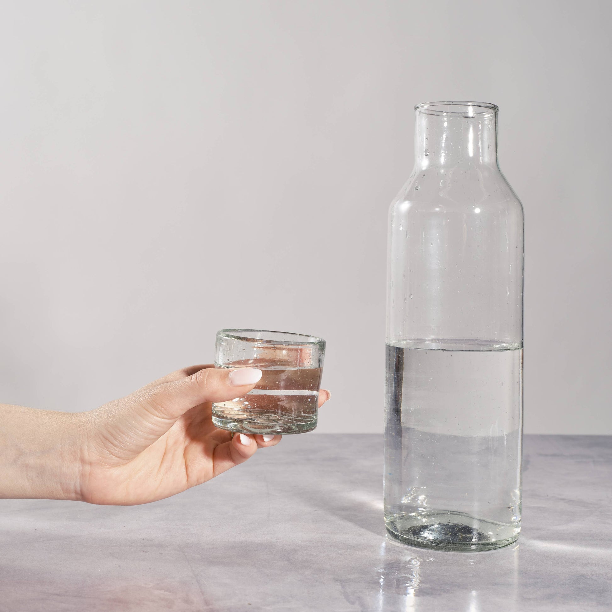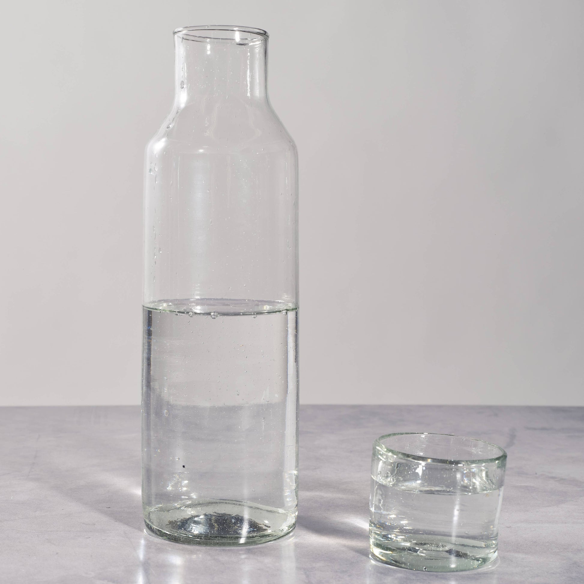 This large slim glass carafe with up is a beautifully handblown set made from recycled glass in Guatemala. Sleek and functional, it’s perfect for bedside water service, guest rooms, office desks, or minimalist kitchen tables.