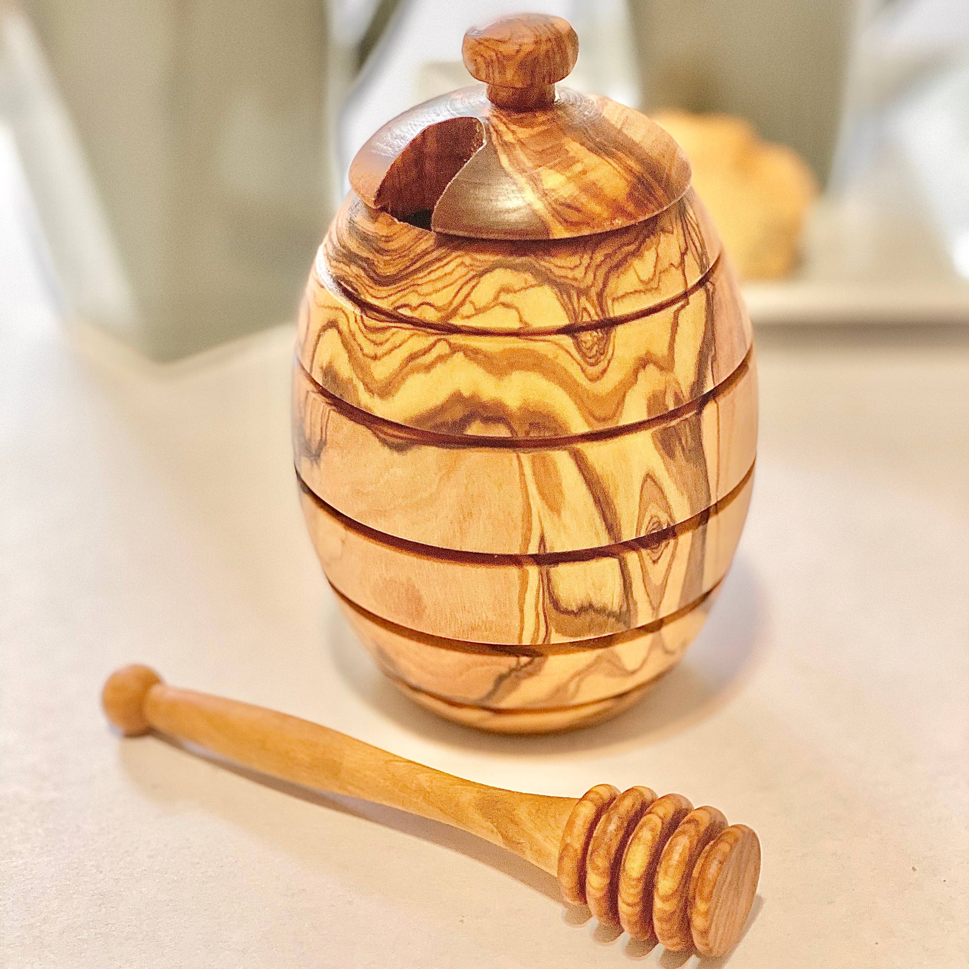 This cute Honey Jar with Dipper is a perfect accessory for storing your favorite honey. There are no chemicals or sealants on the wood. They are all natural and coated with only olive oil.