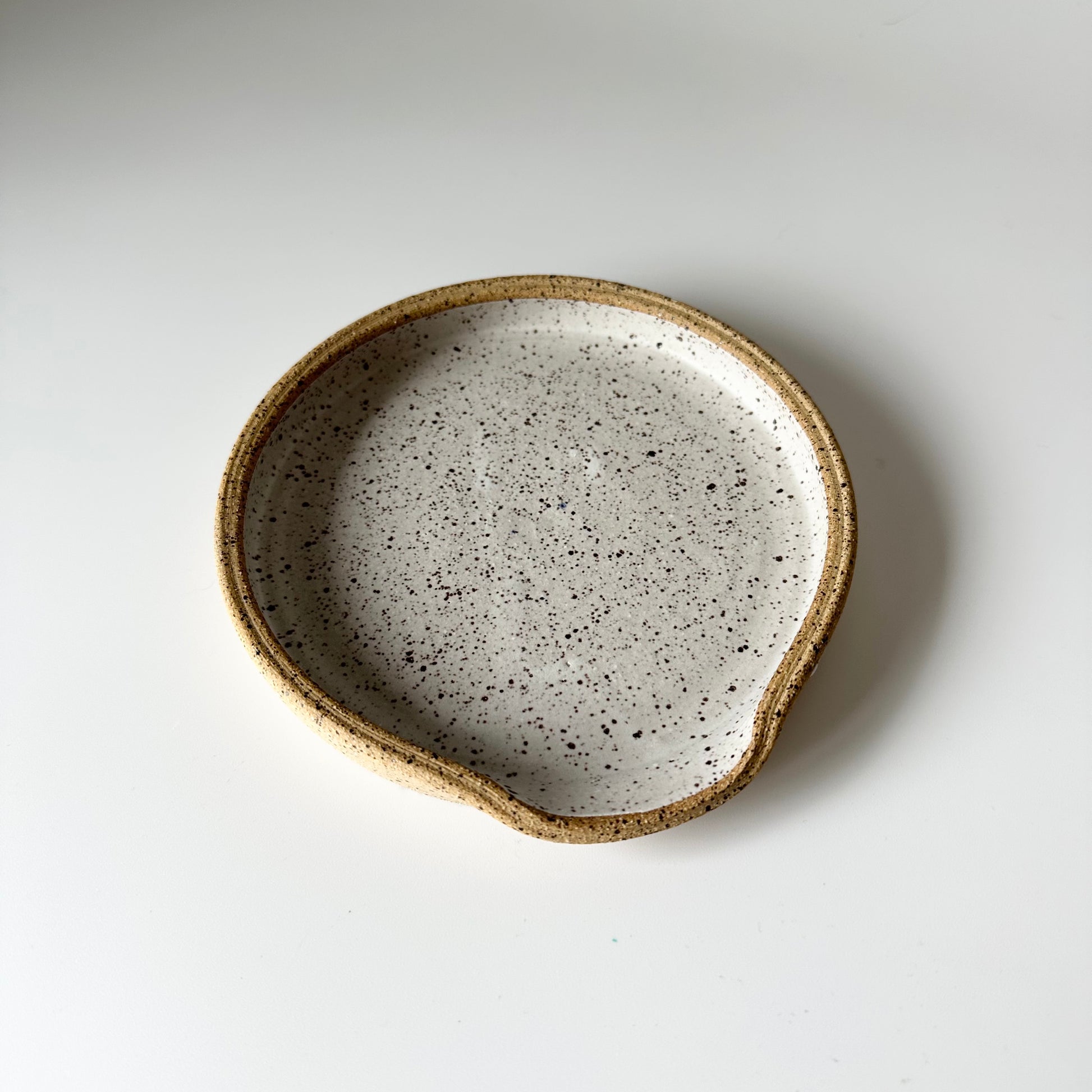 Tan speckled with white glaze spoon rest handmade by Lifestyle Pottery for Wilde Home. Pairs perfectly with our olive wood kitchen utensils.